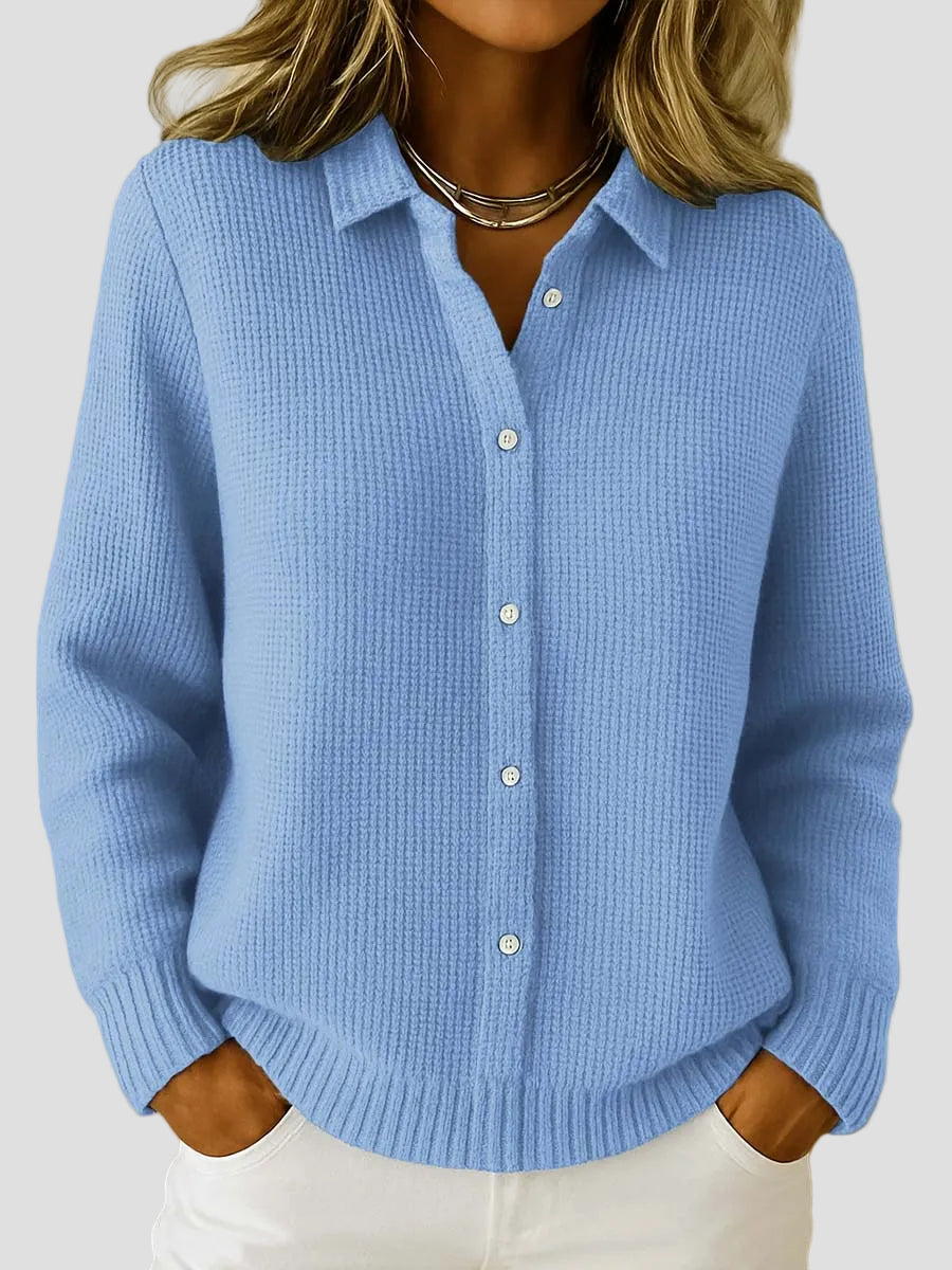The Marisse Button-Up Knit Cardigan embodies understated elegance with a touch of cozy refinement. Designed with a classic button-down front and a softly structured collar, it blends comfort and sophistication in perfect harmony. The high-quality knit fabric offers a smooth, breathable feel while draping beautifully over your silhouette—making it the ideal piece for layering through every season.
