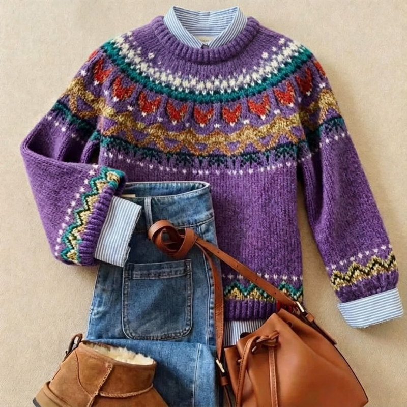 The Violet Cozy Knit Sweater is designed for women who love feeling warm, comfortable, and quietly confident, with a touch of joyful detail. With its beautifully patterned yoke, relaxed long sleeves, and classic crew neckline, it brings a polished look to everyday outfits while still feeling soft and easy to wear. Whether you are heading out for a crisp morning, meeting friends for lunch, or enjoying a calm weekend at home, Violet adds warmth and charm you will reach for again and again.